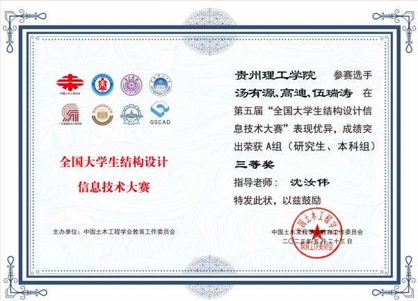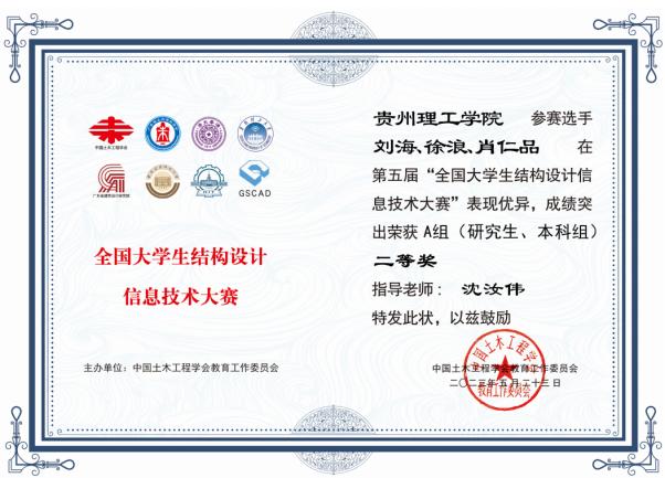 在第五届全国大学生结构设计信息技术大赛中,土木工程学院14名参赛学生在沈汝伟老师的指导下获得了二等奖1项、三等奖5项。
