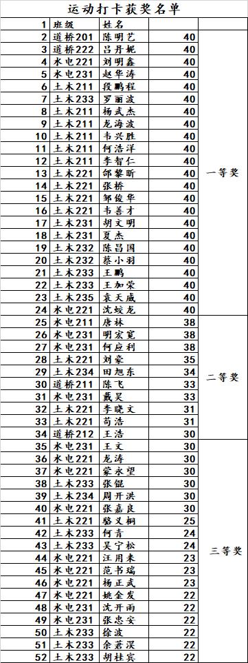 本网讯(土木工程学院 文/杜红阳 图/张毫雲)2023年10月16日-11月21日历时40天的“阳光早晨”打卡活动圆满结束。此次活动共300余人参加,其中英语打卡模块共计27名同学获奖,一等奖12名,二等奖5名,三等奖10名;运动打卡模块共计51名同学获奖,一等奖23名,二等奖10名,三等奖18名,具体获奖名单如下图: