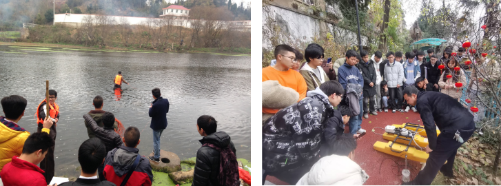 (学生开展河流断面测量工作和学习无人船测量技术)
