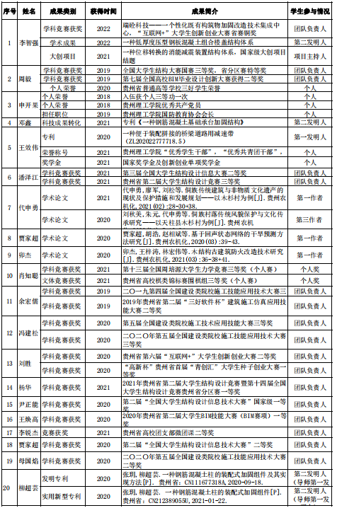 近3年,本专业获“黄大年”教学科研团队2个,教师获贵州省教学竞赛三等奖1项,贵州理工学院教学竞赛一等奖2项,二等奖3项,贵州理工学院课程思政教学名师7人。科研方面,本专业教师获贵州省科技进步奖1人,承担国家自然科学基金项目9项,国家社科基金项目1项,贵州省科技技术基金及国家重点实验室项目20项,其它省部级及横向项目若干,年均项目经费约300万元。发表科研论文SCI/EI论文7篇,专利10余项,专利转化10万元,承办300人以上学术会议3次。拥有“数字建筑设计”与“工程建设数字孪生”2个教育部协同育人创新中心,“乡村建设工程技术研究中心”和“智能建造产业学院”等8个校企共建科研平台。