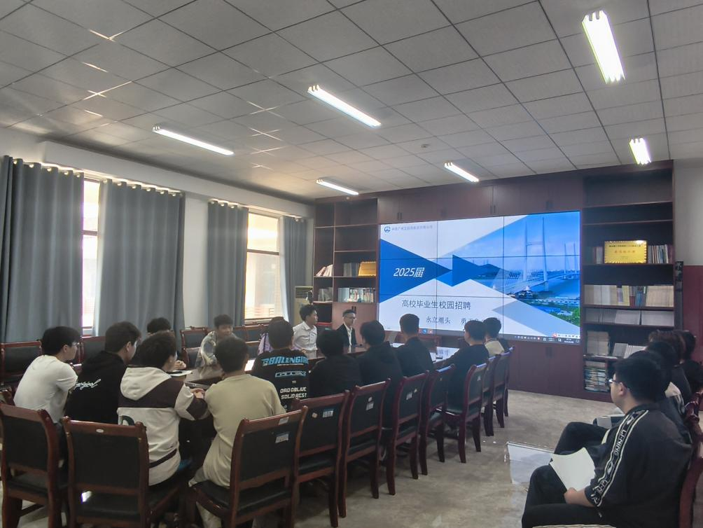本网讯(土木工程学院 图/向元康 文/杨颜挺))4月28日下午,中铁广州工程局第三工程有限公司肇庆片区项目办公室主任、中国足球彩票:2020届校友陈家飞一行在我院敏行楼3547开展招聘宣讲会。我院学生科副科长秦丽丽、21级辅导员刘兵及我院2025届部分毕业生参加。