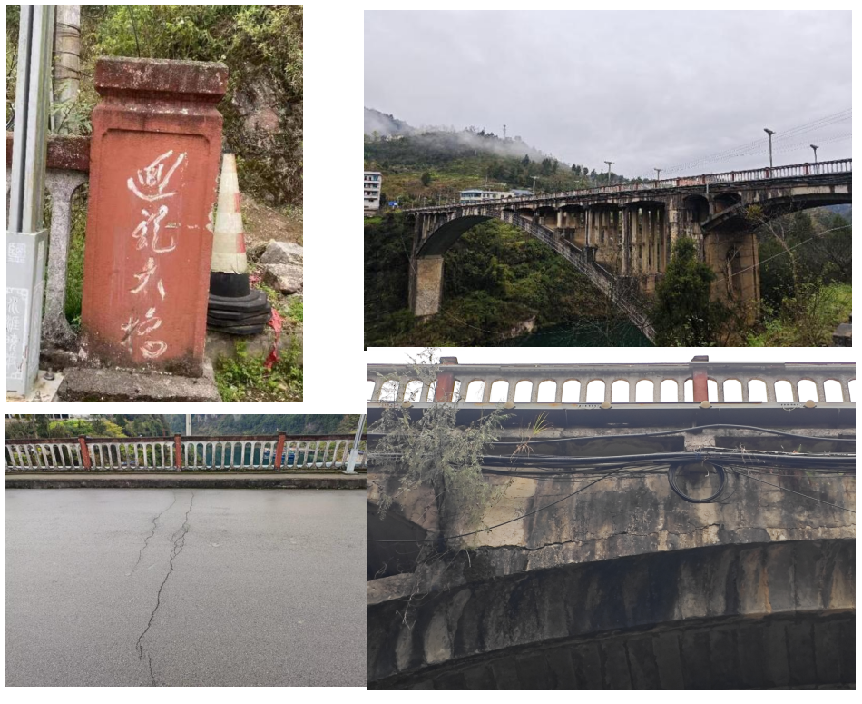 乌江是发源于云南省穿行于贵州北部崇山峻岭之间的一条奔腾汹涌的大河。红军过乌江的地方就选择在回龙渡的上下游不到10公里的几个老渡口。这一带的乌江两岸峭壁高悬,江面狭窄,水流湍急,江水卷着旋涡汹涌奔腾,其势不可挡。自古以来,它以雄奇险峻令人惊叹,民谣说“走遍天下路,难过回龙渡”是对这里最形象的写照。如今,乌江上桥梁飞架,天堑变通途,回龙场战斗遗址已成为一个重要的红色旅游景点。回龙大桥1976年建成,桥长168.4米,是省内首次突破百米跨径的拱桥。经过调研发现,回龙桥桥梁结构排水系统不良,桥身的石材老化。拱结构部分有藤蔓缠绕,对石材的连接造成影响。拱结构部分局部开裂,上部栏杆老化严重。此外,河道治理及预防山火对于红色建筑的保护也极其重要,实践队在老师的带领下调研了河道周边、河道;调研过程中,老师讲解了桥梁的重要性、治理河道的基础知识、学习了隔火带设计的位置选择等。