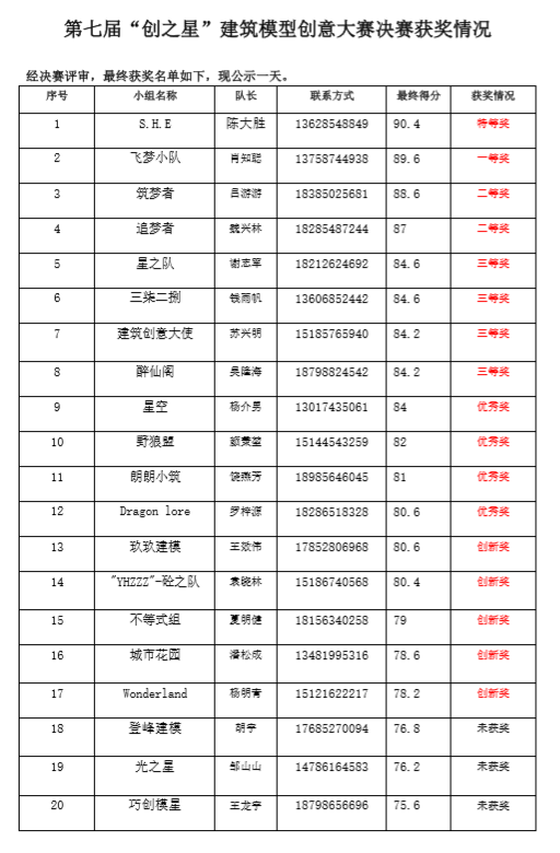 本次大赛评选出特等奖一组、一等奖一组、二等奖两组、三等奖四组、优秀奖四组、创新奖五组