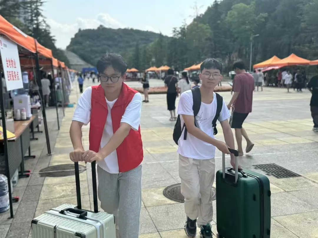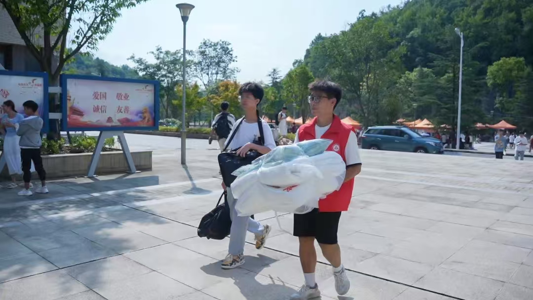 学院学长作为引导员,陪同新生前往宿舍区办理入住手续。