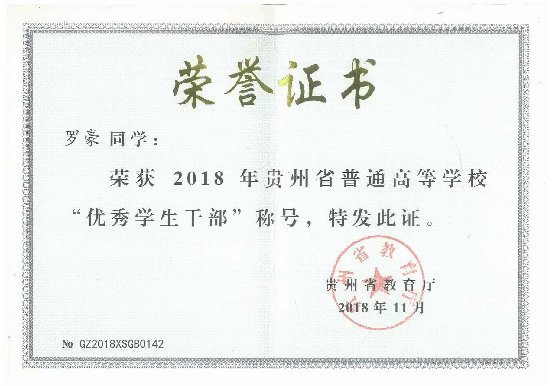 获得国家励志奖学金、贵州省优秀学生干部、校优秀学生干部、校优秀共青团干部、校优秀共青团员、校航模科技竞赛三等奖、校运会跳高第二名、校运会跳远第二名等。获得实用新型专利1项、外观专利1项。