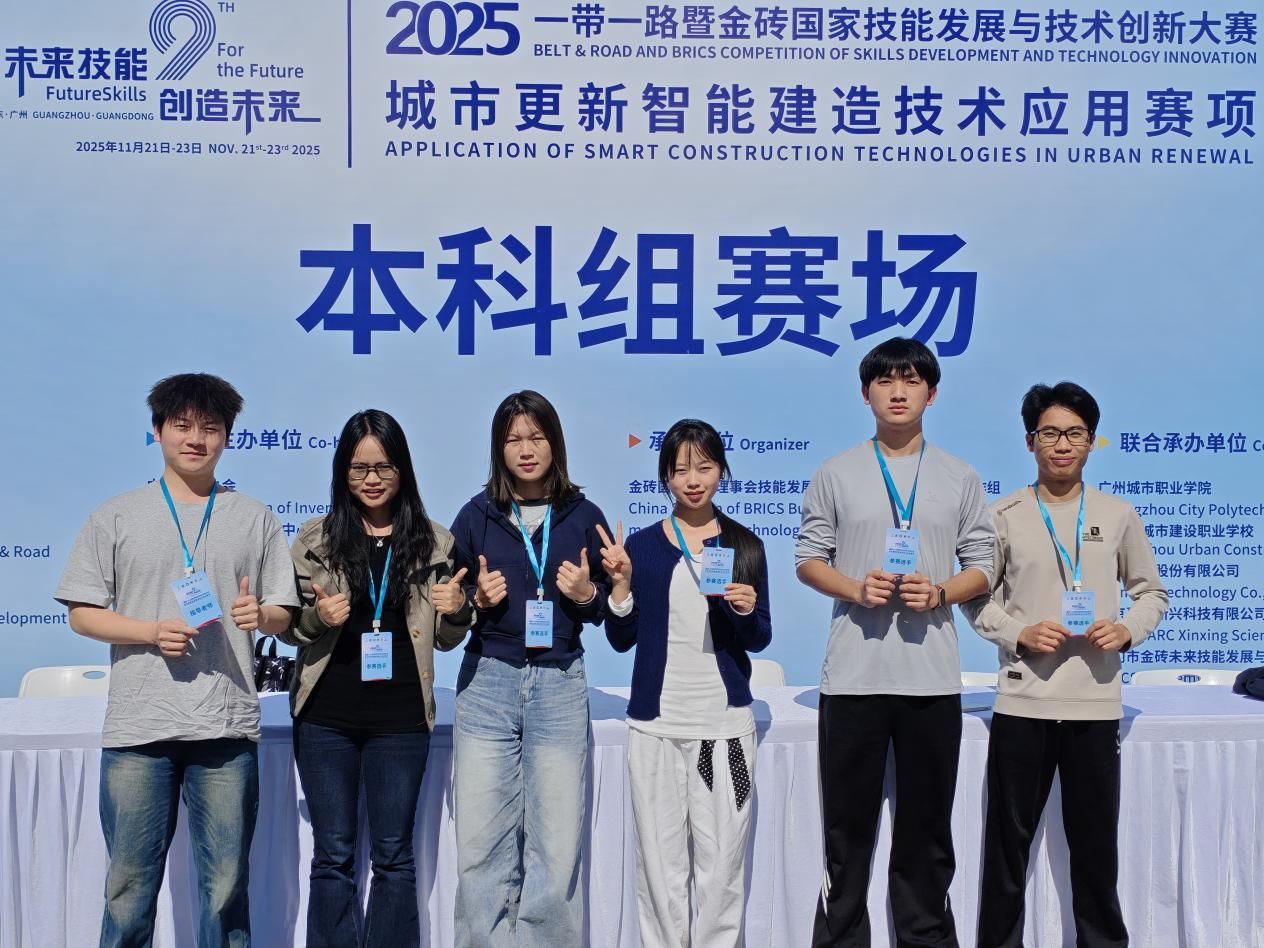 本网讯(土木工程学院 图文/田海霞)近日,2025一带一路暨金砖国家技能发展与技术创新大赛“城市更新智能建造技术应用赛项”全国总决赛在广州圆满落幕。我院学生秦杏、罗丽波、黎永康组成的参赛2队与田海霞、龙海东、王志豪组成的参赛队4队,在“智建”班主任工作室主持人沈汝伟老师的指导下,在聚焦“人工智能+建筑施工”的赛场上凭借在BIM建模、智能施工、监测数据分析等环节的出色发挥,分别荣获全国二等奖与三等奖,展现土木学子新风采。