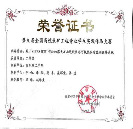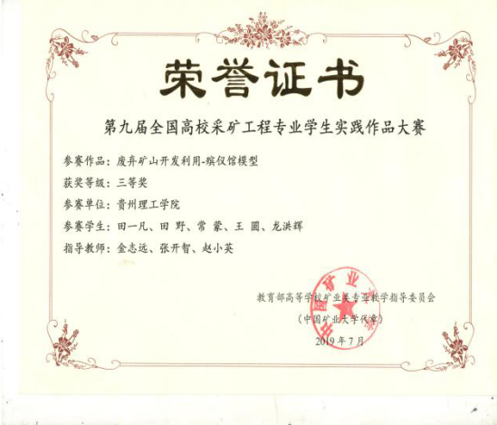 在办好活动的同时,也鼓励同学们积极“向外走”,到更大的平台施展自己的才华。2016级李响、田一凡等同学在专业教师的指导下,分别荣获“第九届全国高校采矿工程专业学生实践作品大赛”二等奖、三等奖。
