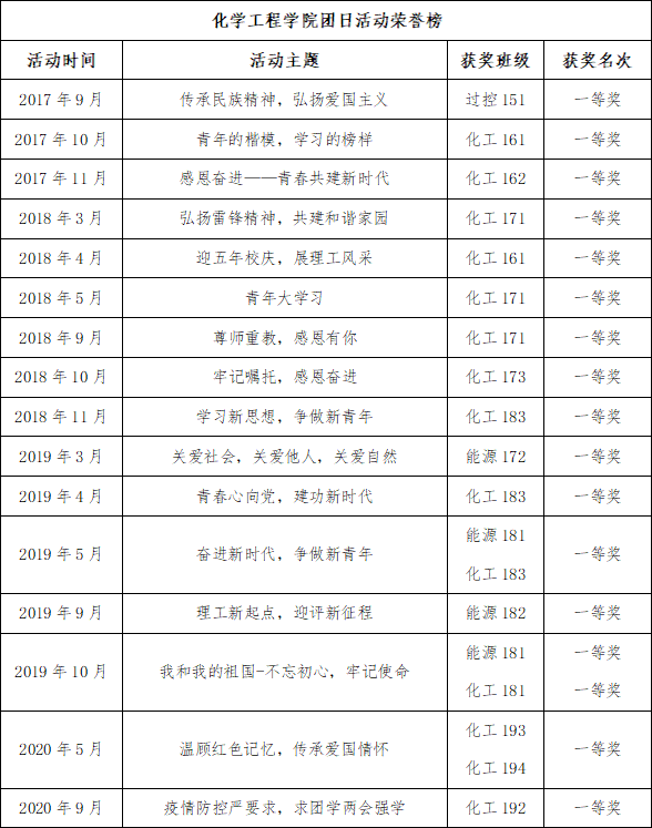 化工学院秉承“以活动育人、树班风,正学风”的理念,组织班级团日活动,展现班级凝集力 。从2017年9月至今,化工学院团组织生活在校级评比中荣获十四连冠,班级获得一等奖共计17次。