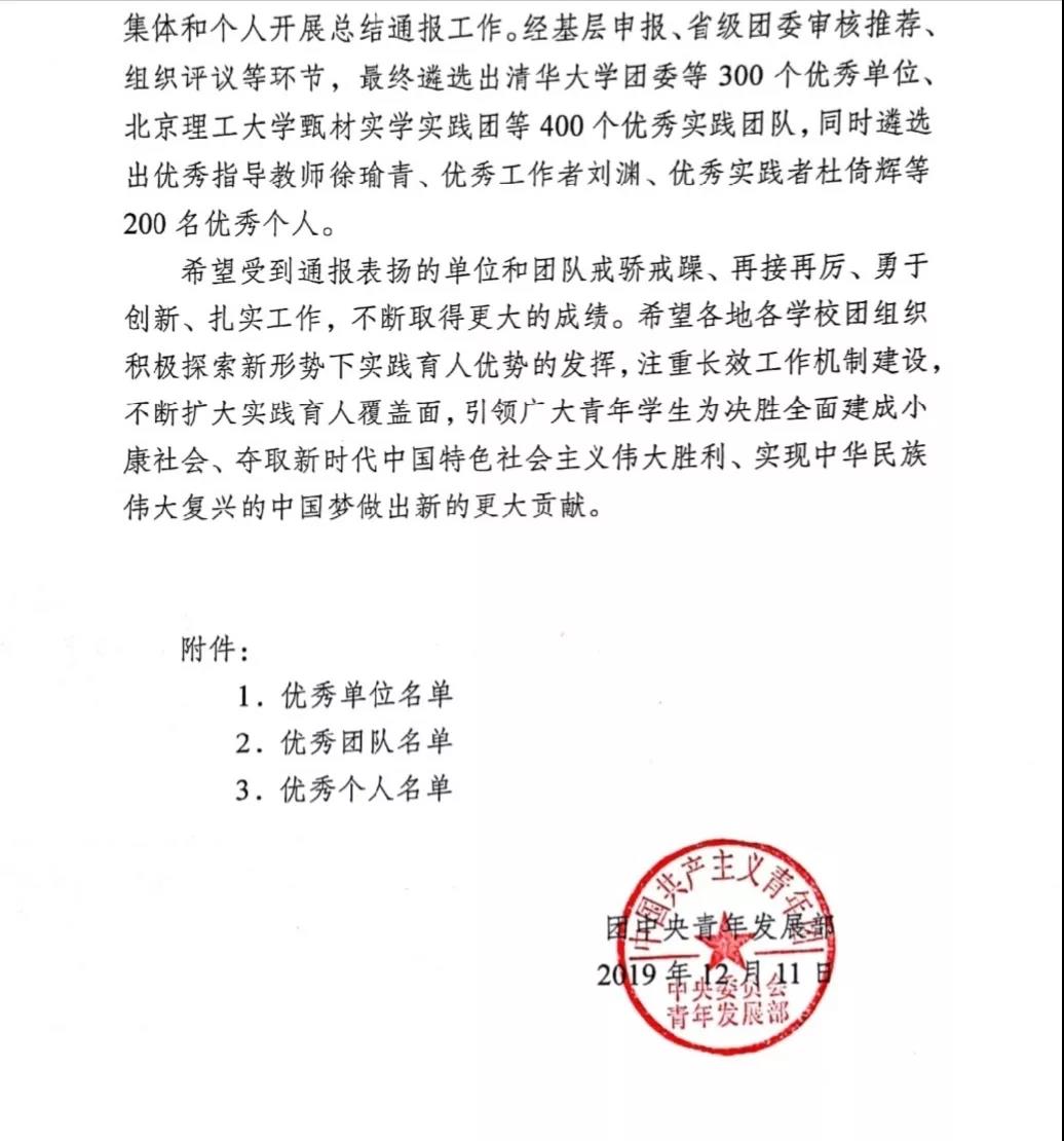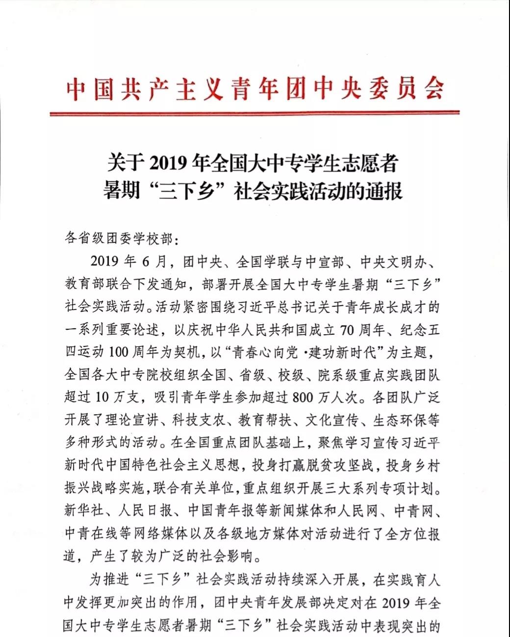 2019年12月11日,中国共产主义青年团中央委员会青年发展部发布了中国足球彩票2019年全国大中专学生志愿者暑期“三下乡”社会实践活动的通报,此次通报中,中国足球彩票:光影映学支教队荣获2019 年全国大中专学生志愿者暑期 “三下乡”社会实践活动优秀团队称号。具体文件如下: