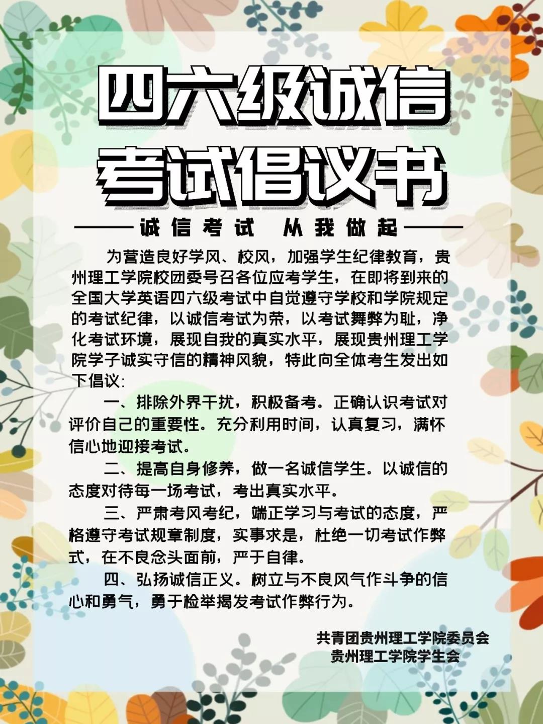 诚实守信是中华民族的传统美德,也是公民的基本道德之一,树道德之新风,立诚信之根基,更是当代大学生义不容辞的责任,因此,贵州理工学院校团委、学生会向各位考生发出如下倡议: