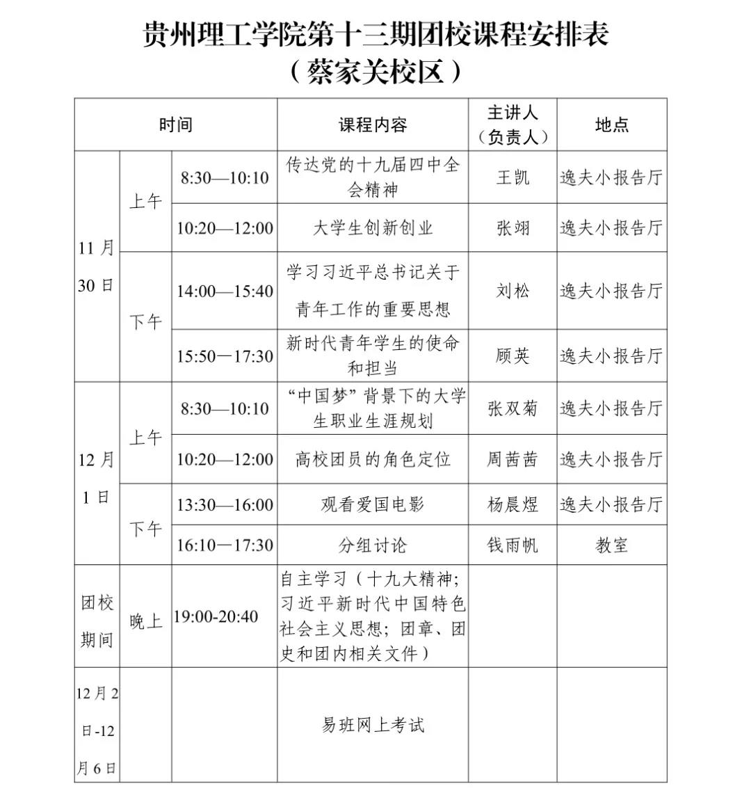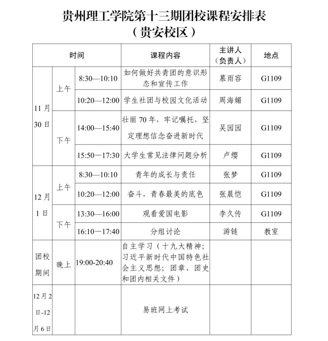 贵州理工学院第十三期团校课程安排表
