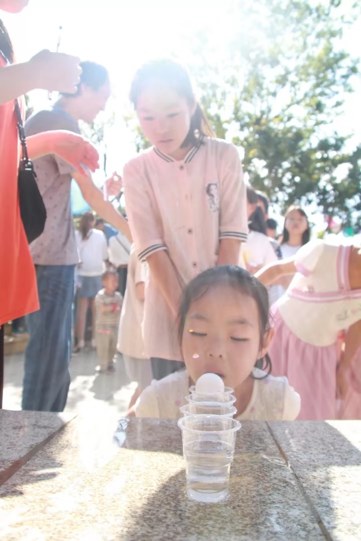 “步步为营”---------有四个装有水的杯子,球在第一个杯子里,用力吹球到最后一个杯子里并保证球不离开杯子即为挑战成功,可获得一张奖券!