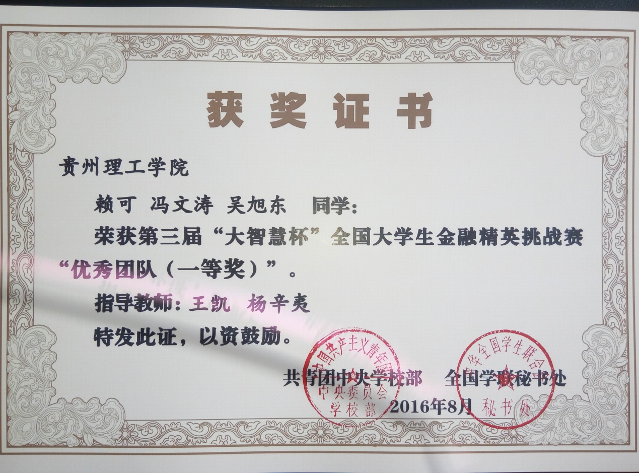近日,由共青团中央学校部、全国学联秘书处主办,全国学校共青团研究中心协办,上海大智慧股份有限公司承办的2016年第三届“大智慧杯”全国大学生金融精英挑战赛落下帷幕,其中校赛由经济管理学院承办。中国足球彩票:学生第一次参加该项比赛,经过激烈角逐,获一等奖一项,三等奖三项。