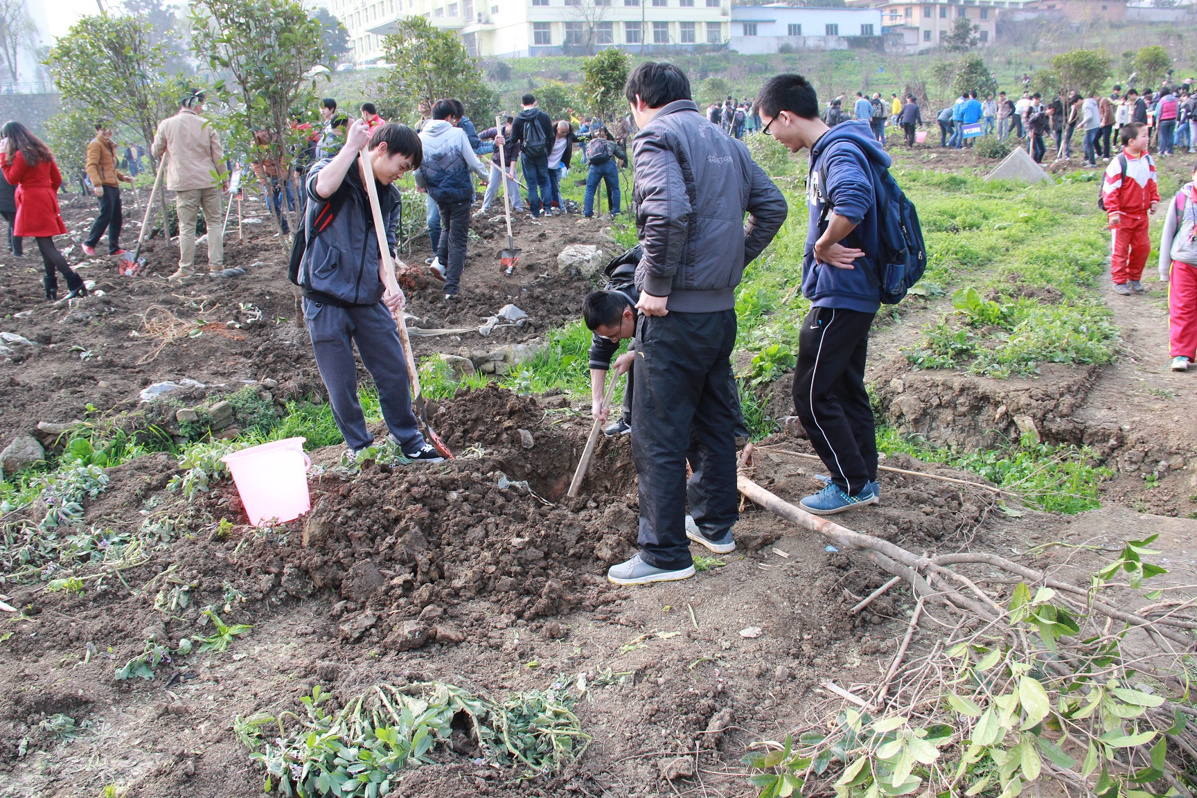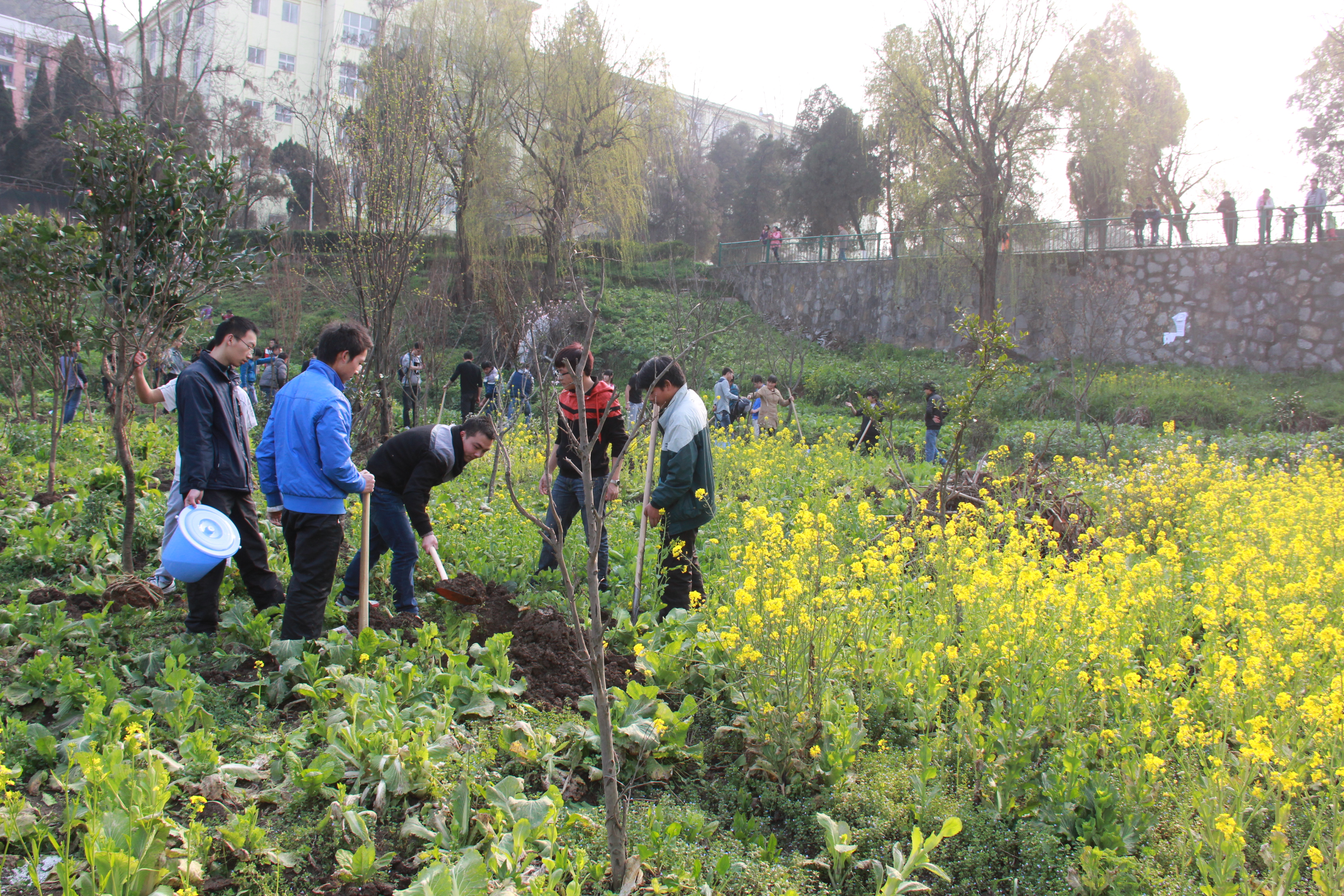 时值第35个植树节,为了增强中国足球彩票:师生的环保意识和生态理念,积极投身于美化校园环境的行动中,践行社会主义核心价值观,全面推进中国足球彩票:绿色校园的建设。3月12日下午,贵州理工学院“许美好愿望、我为校园增片绿”植树活动在学校桃花园内举行,全体校领导,学校各单位教师代表以及2013级60个班级学生代表共计300余人参加了此次公益植树活动,共计载种下400棵树苗。