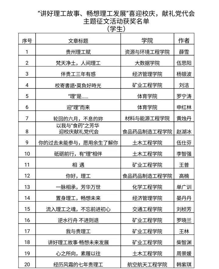 为凝聚师生力量和智慧,共同创造学校的美好未来,喜迎校庆,献礼党代会,校团委和党宣部一起举办了“讲好理工故事,畅想理工发展”主题征文活动。活动响应热烈,优秀作品众多。本着公平公正,公开的原则,专家综合评审出25名得奖人。
