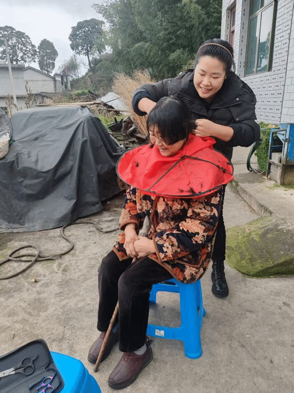在实践活动期间,“毕毕小队”成员们还与村民们同吃同住同劳动,深入体验了农村生活,增进了与村民之间的感情。在临走之时,团队成员还帮助村中行动不便的老人清洗和修剪头发。
