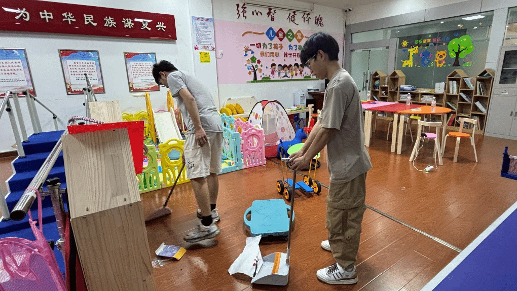活动首日,实践队将目光投向社区儿童娱乐区。针对社区儿童娱乐区玩具散落、地面杂乱等问题,队员们分工协作,清扫地面、整理游乐设施、擦拭滑梯与秋千,经过一小时的努力,整个区域变得整洁有序,为孩子们营造了安全舒适的游玩环境。