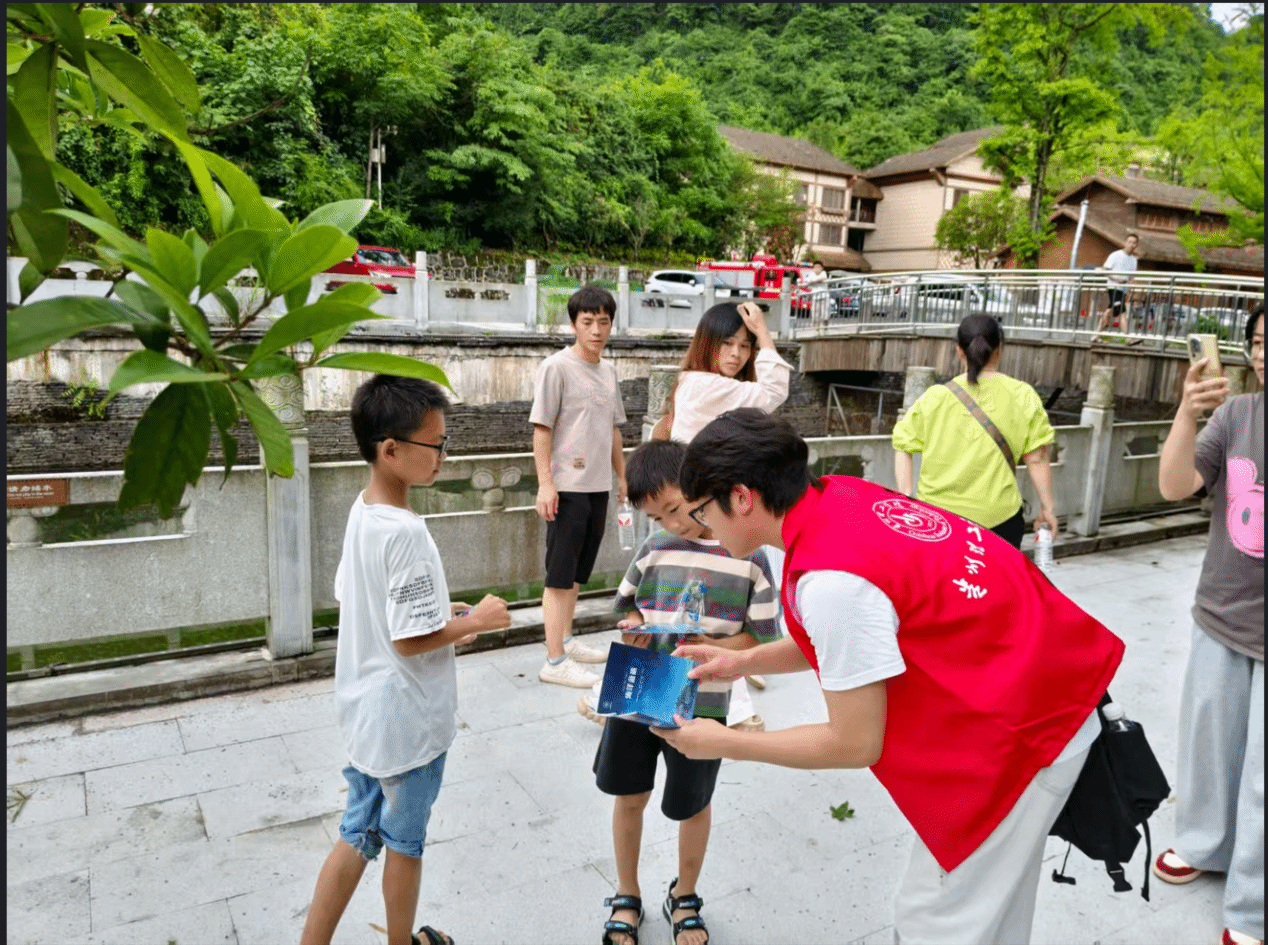 实践团始终将安全保障视为文旅可持续发展的根基,因此将实践活动范围延伸至旅游安全领域,于7月22日在九道水景区开展“防灾减灾”知识宣讲。队员们沿栈道向游客普及地质灾害避险、夏季防汛等知识,发放图文手册详解“旅游途中突发险情的自救方法”。这场活动不仅为景区构建了安全防线,更促使团队对“村宿 + 文旅”生态有了更为深刻的认识——唯有筑牢安全这一底色,才能让游客毫无顾虑地尽情体验乡村之美,推动村宿与文旅项目实现长远稳健发展。