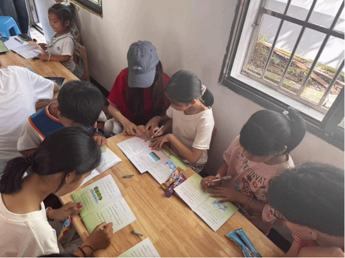 交流结束后,科普行动随即展开。实践团队走进村里的“儿童之家”,将提前准备好的环保知识绘本分发到孩子们手中。队员们用生动故事讲解垃圾泛滥对生态环境的危害,将抽象概念转化为趣味认知,以童心为桥,将环保的种子播撒进孩子们的心田,也为乡村生态环境的改善注入了新动力。