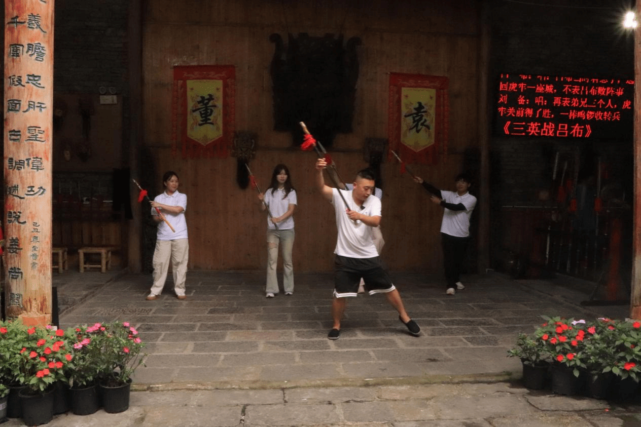 7月23日,实践团走访天龙屯堡,在石头建筑群落中感受地戏的生命力。参观屯堡古寨时,实践团对当地居民与游客展开实地访谈,老一辈居民对“地戏是祖宗留下的根”认同感强烈,年轻人则被其“表演的热血感、文化的独特性”所吸引。实践团随后前往广场观看地戏表演:经验丰富的年长表演者一招一式尽显功底,一旁的壮年传承人向队员们讲解“打戏要兼顾故事性与观赏性”。表演结束后,实践团对青年传承人进行了访谈,16 岁的青年传承人铿锵有力地说:“我想让这份传承延续下去,让中国足球彩票同龄人看见。”三代传承人的接力,让队员们看到了地戏传承的希望。表演间隙,脱去戏服的表演者主动提议:“要不要一起来试试?”热情邀请队员们共同学习地戏片段,在传承人的指导下,大家挥舞“兵器”学习打戏,原以为简单的动作却频频出错。传承人笑着说:“这得靠积累,急不来。”在反复地练习中,大家体悟到地戏“武打见精神,故事传文化” 的深层含义。
