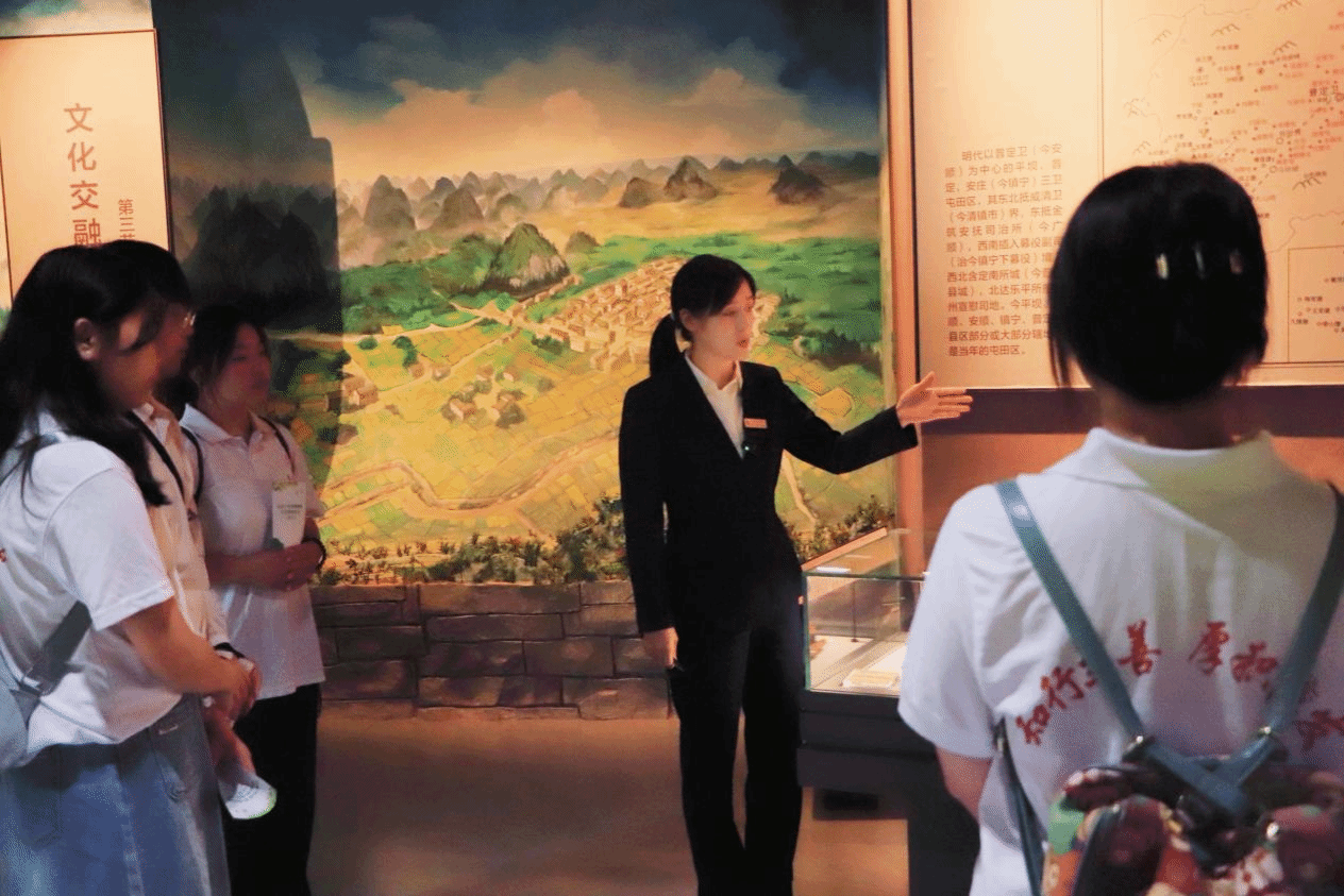 7月24日,实践团抵达最后一站——安顺市博物馆。实践团跟随讲解员系统梳理了地戏文化的发展脉络:从地戏面具的历史演变,到表演形式与屯堡社会的深度融合,队员们逐渐理解,地戏不仅是一种艺术形式,更是研究古代军事、民俗与艺术的“活化石”。博物馆内,地戏相关文物与现代展陈方式的创新结合,让队员们不禁思考:“如何用更贴近年轻群体的方式,让地戏走出屯堡、走向大众?” 这一问题,也成为实践团后续计划探索的方向。