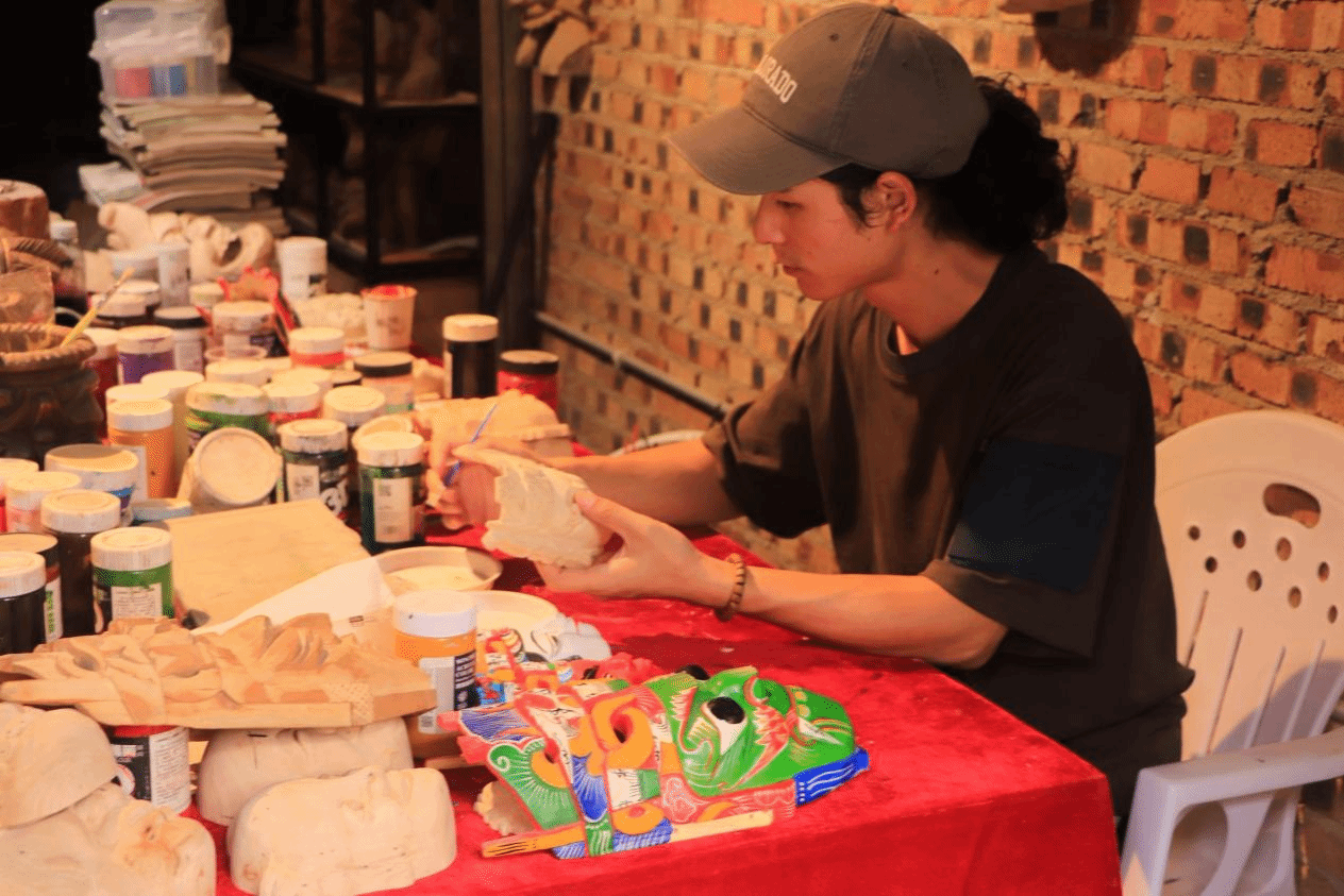 7月22日,实践团深入安顺市旧州古镇,聚焦地戏面具的“灵魂”所在。在一家面具制作店内,队员们见识到不同角色面具的独特设计:关羽面具以红脸彰显忠义,张飞面具以黑脸凸显刚猛,细节之处暗藏着千年戏曲文化的角色特征。店主一边手把手教队员们上色,一边讲解面具的颜色象征及雕刻手法的要点,让大家在实践中体会到地戏面具“一凿一刻皆传承”的匠心。实践团在采访游客时发现,多数人因“神秘面具、独特表演”被地戏吸引,但也有人困惑于“地戏表演难懂”,这些反馈为后续的文化推广传递了精准的需求信号。