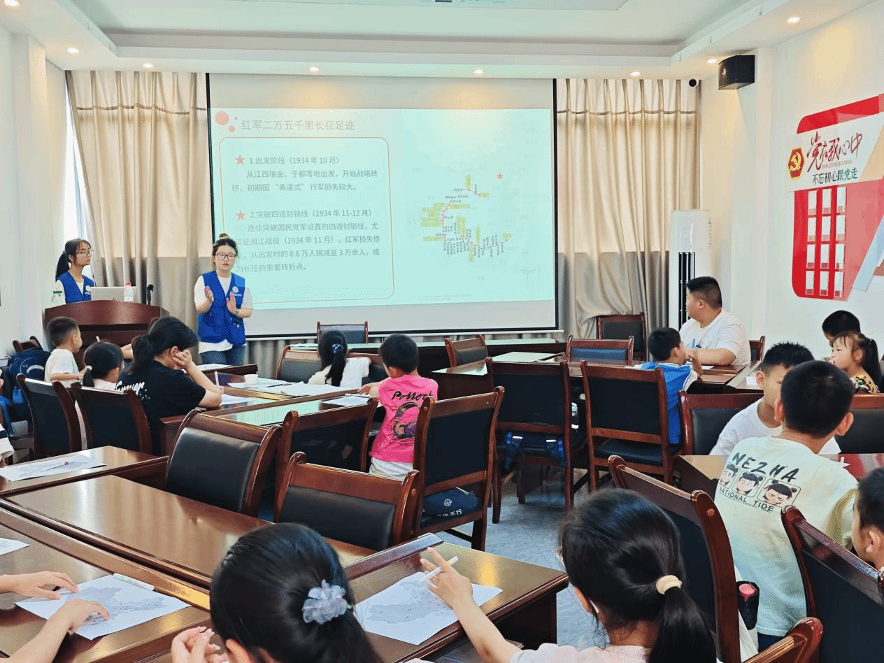 7月18日至19日,实践队在贵阳市白云区天林社区新时代文明实践站,为社区青少年学习活动提供志愿服务。活动中,学生党员罗利萍对小朋友们进行红色宣讲,她介绍了中国共产党的诞生、发展历程与伟大成就,讲解了党旗、党徽的含义,还讲述了雷锋、王二小的感人事迹以及《鸡毛信》等经典红色故事。为加深了解,寓教于乐,队员们开展了红色文化互动辅导活动,带领小朋友们重温红军长征路线,进行模拟炸碉堡、模仿革命雕塑等红色文化小游戏,让孩子们在趣味中了解党的奋斗历史和革命精神。小朋友们认真参与,纷纷表示要向革命英雄学习,努力成长,传承先辈们的革命精神。
