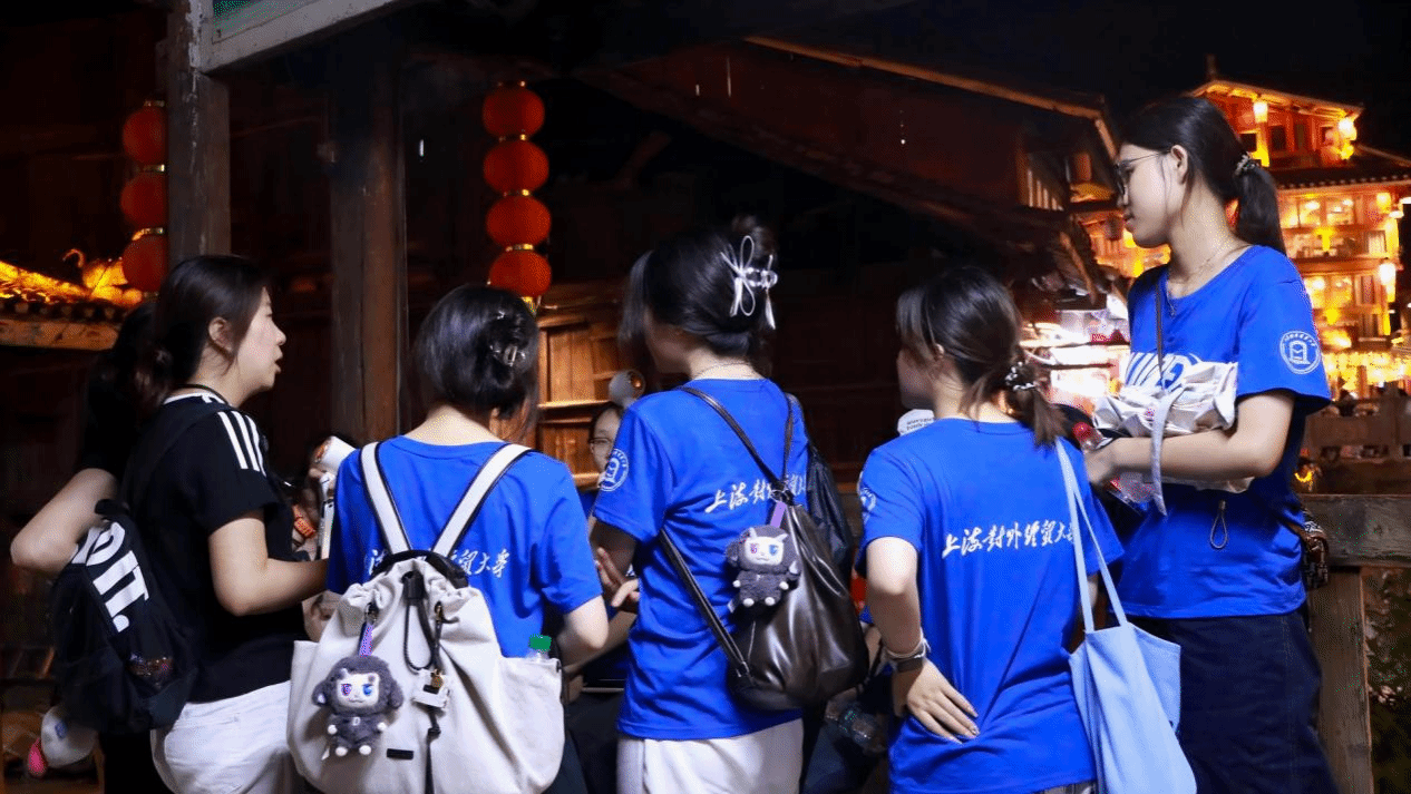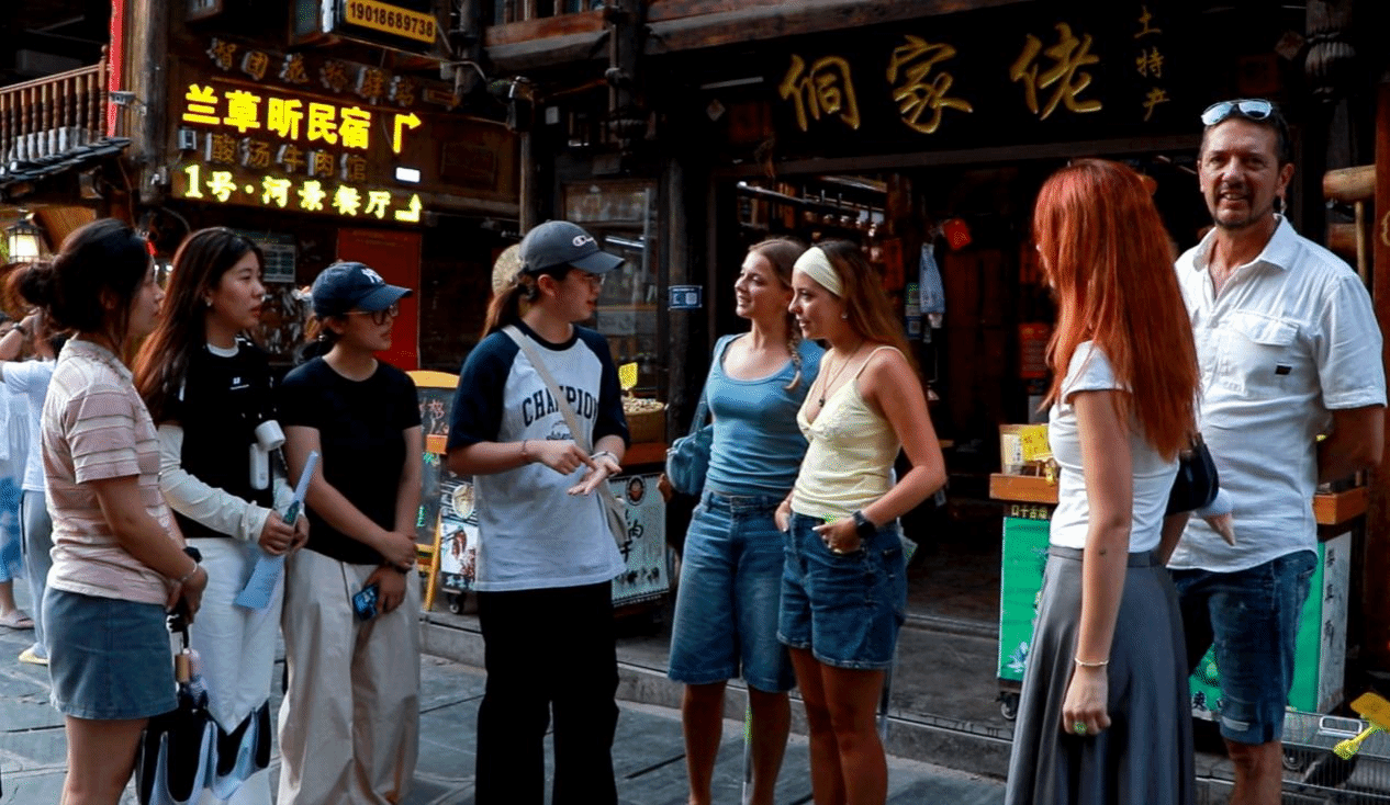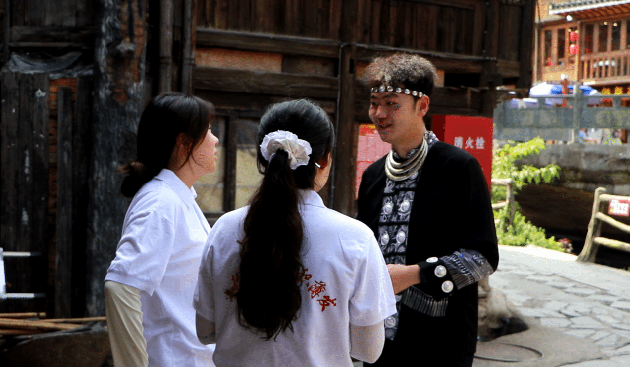 团队刚抵达肇兴侗寨,便在风雨桥畔与外国游客相遇。队员们主动上前交流,用流利的英语讲述鼓楼营造技艺的历史渊源与工艺特色、侗族大歌的非遗传承脉络。通过精准的文化解读,队员们在跨文化沟通中传播民族文化,生动践行“民族的就是世界的”理念,成为民族团结与文化传播的鲜活载体。夜幕渐深,当地特色的篝火晚会拉开序幕。这场晚会不仅是一场欢乐的聚会,更是一次心灵的交融。队员们在体验侗族传统文化独特魅力的同时,也拉近了与侗族同胞的距离,感受到民族团结带来的融洽氛围,为后续的实践活动奠定了良好基础。