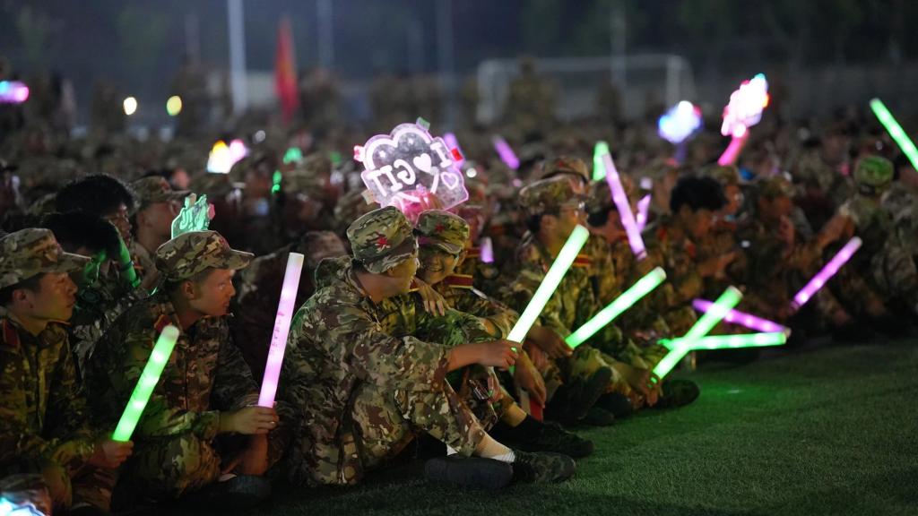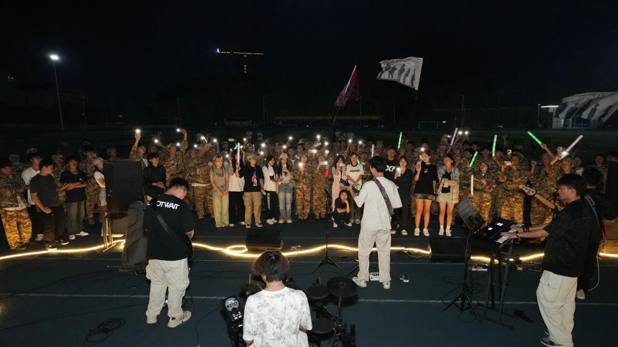 音乐会在这凉爽惬意的夜晚拉开帷幕,田径场上军训的新生已安顿完毕,围坐在舞台旁,期待着这场音乐盛宴的开始。随着主持人的开场白,音乐会正式启动。吉他社以一首《晴天》开端,轻快的旋律,娴熟的指法,瞬间将现场观众带入充满阳光与希望的青春氛围中。说唱社的原创歌曲紧接着登场,用富有韵律的歌词和激情四溢的演唱,为音乐会注入了一股强烈的青春活力与创新气息。