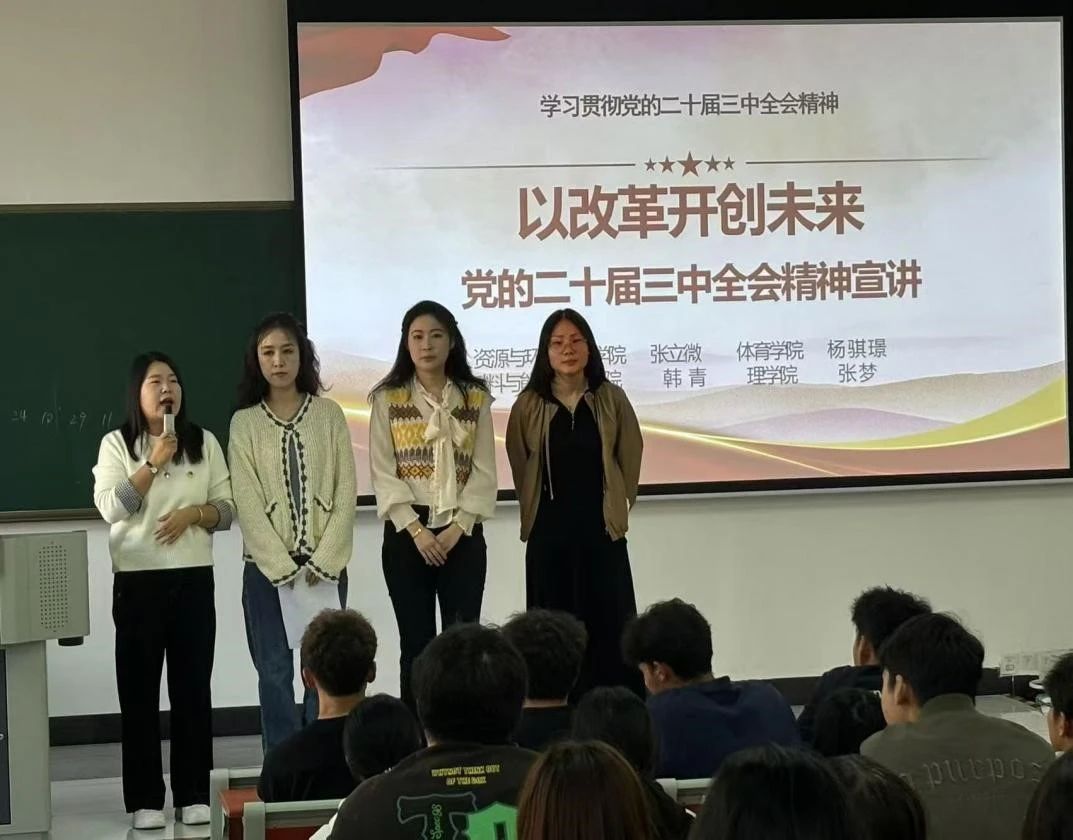 2024年10月29日,资源与环境工程学院、材料与能源工程学院、体育学院和理学院于敏学楼102教室开展党的二十届三中全会精神联合宣讲活动。本次宣讲由资源与环境工程学院张立微老师、材料与能源工程学院韩青老师、体育学院杨骐璟老师、理学院张梦老师共同主讲,各学院学生党员、学生代表积极参与。