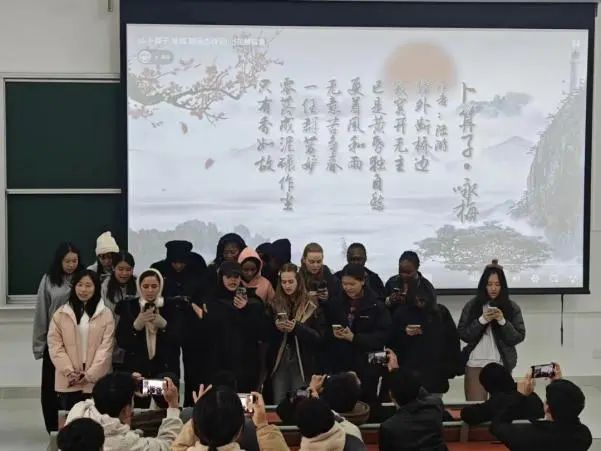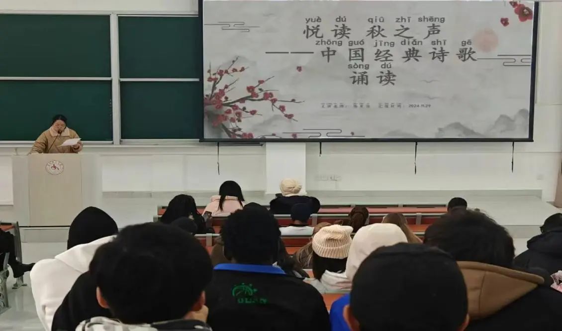 11月29日,朗诵协会联合国际教育学院在致知楼414教室举办“悦读·秋之声”中外学生中国经典诗歌诵读活动。本次活动旨在通过宋代诗人陆游的名篇《卜算子·咏梅》,向来自28个国家的留学生传递中国古典诗歌的独特魅力。