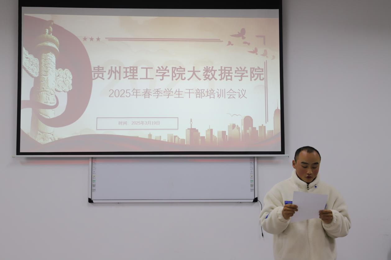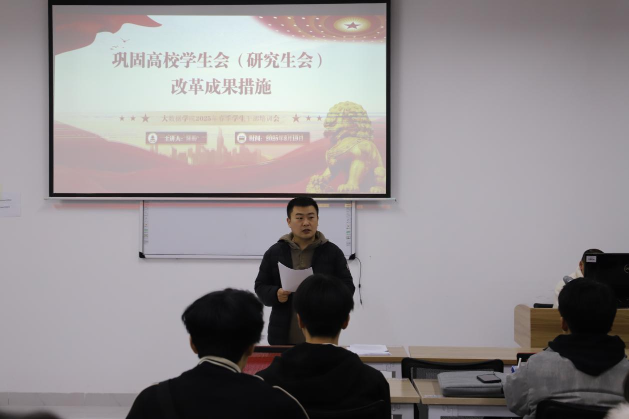 为深入贯彻习近平新时代中国特色社会主义思想,贯彻高校学生会改革相关文件精神,确保学生会组织牢记使命、担当作为。2025年3月19日晚,大数据学院面向学院全体团学组织成员在睿知楼404召开春季学期学生干部培训大会,院党总支副书记武斌到场指导并领学重要文件。
