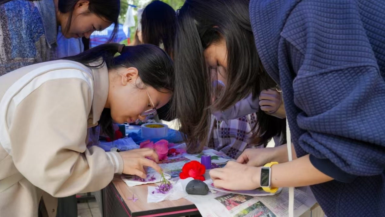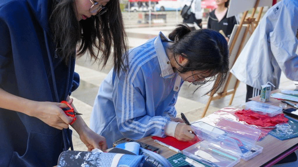 晨光熹微中,手工体验区已人头攒动。非遗剪纸展台前,银剪翻飞似蝶舞,学子们以刀代笔,将春意定格于方寸红笺;漆扇创作区内,素胚点染成青绿山水,二十四节气跃然扇面,漆艺古法与现代审美在此交融;古法拓印处,木槌轻叩间,玉兰海棠次第绽放于棉麻布袋,植物脉络与水墨丹青共绘春韵。