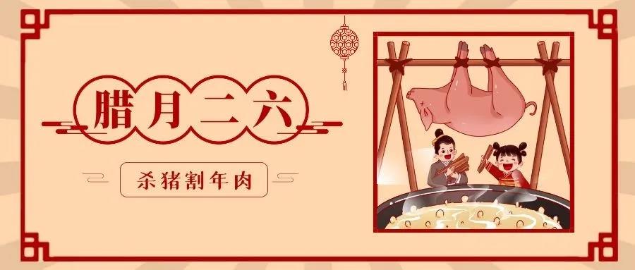 腊月二十六,杀猪割年肉,这一天主要筹备过年的肉食。将"割年肉"放入年谣,是因为农耕社会经济不发达,人们往往在年节中才能吃到肉,故此称为"年肉"。