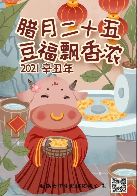 腊月二十五,推磨做豆腐,民间传说灶王上天汇报后,玉帝会下界查访,于是各家各户就吃豆腐渣以示清苦,瞒过玉皇的惩罚。