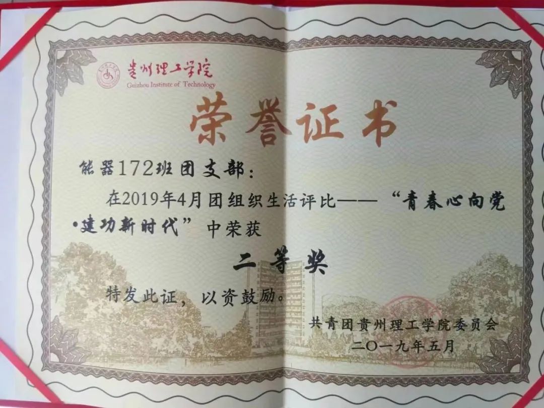 在2019年4月18日举行的“青春心向党,建功新时代”活动中,能器172团支部荣获校级二等奖。此次活动辅导员金先义老师和班主任李翔老师莅临现场指导,活动中成员们积极参与答题,主动表演节目。通过此次活动让大家深刻的体会到了老师们的关心,明白了只有不忘初心,脚踏实地,努力学习,以后才有机会报效祖国,成就自己。