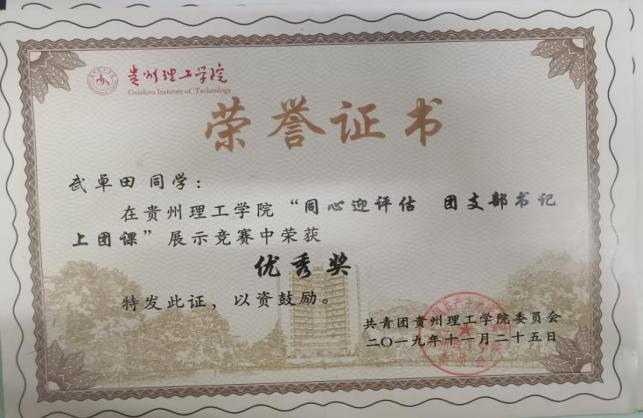 同时为建设更加优秀的团支部,努力打造好一个优秀的团体,团支书武卓田参加“青春心向党、建功新时代”微团课竞赛和“同心迎评估 团支部书记”上团课竞赛,并分别获得校一等奖和校优秀奖,彰显出了团支部的活力。