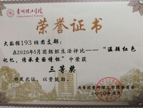 2020年5月大数据193班团支部开展了以“温故红色记忆,传承爱国精神”为主题的云线上团组织生活。大数据学院团总支副书记蒋昀瑶老师及全体支部成员参加。最终,在大家的共同努力之下,大数据193班团支部荣获团组织生活评比三等奖。