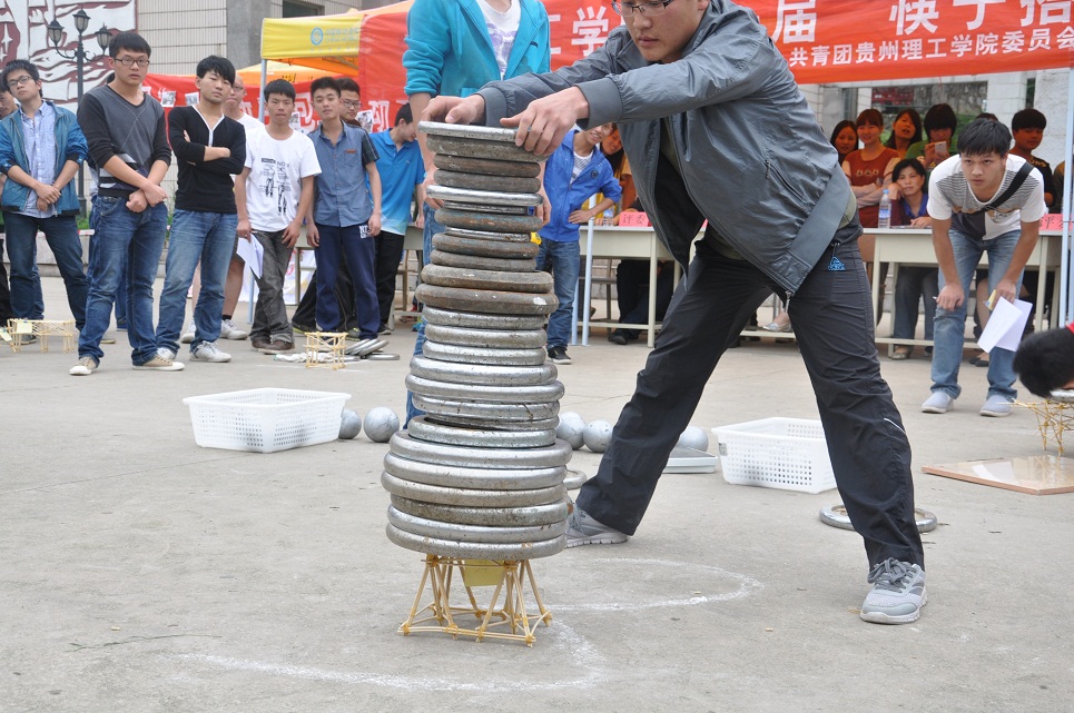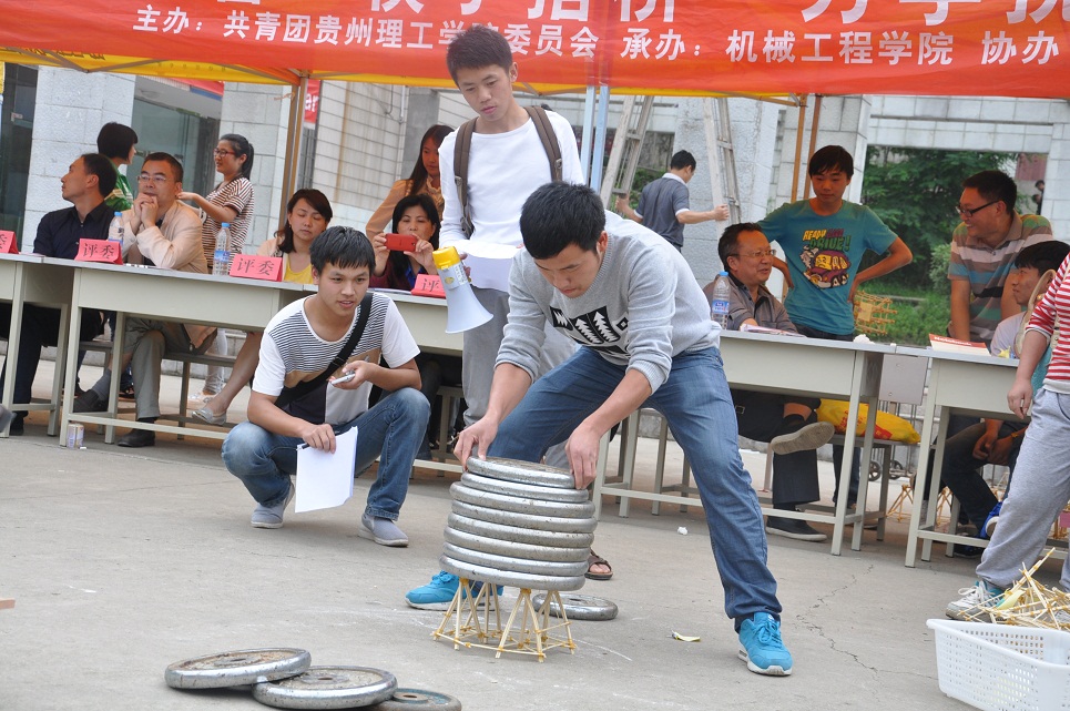 2014年5月28日下午,由校团委主办、机械工程学院团总支承办、机自132班协办的“‘桥’夺天工 创意无限---贵州理工学院首届筷子搭桥力学性能挑战赛”在逸夫广场举行,土木工程学院党总支书记王琳,化学工程学院院长唐安江,制药工程学院副院长张振,机械工程学院副院长高兴勇,学生工作部副部长孙凯,校团副委书记金敏担任此次比赛评委。
