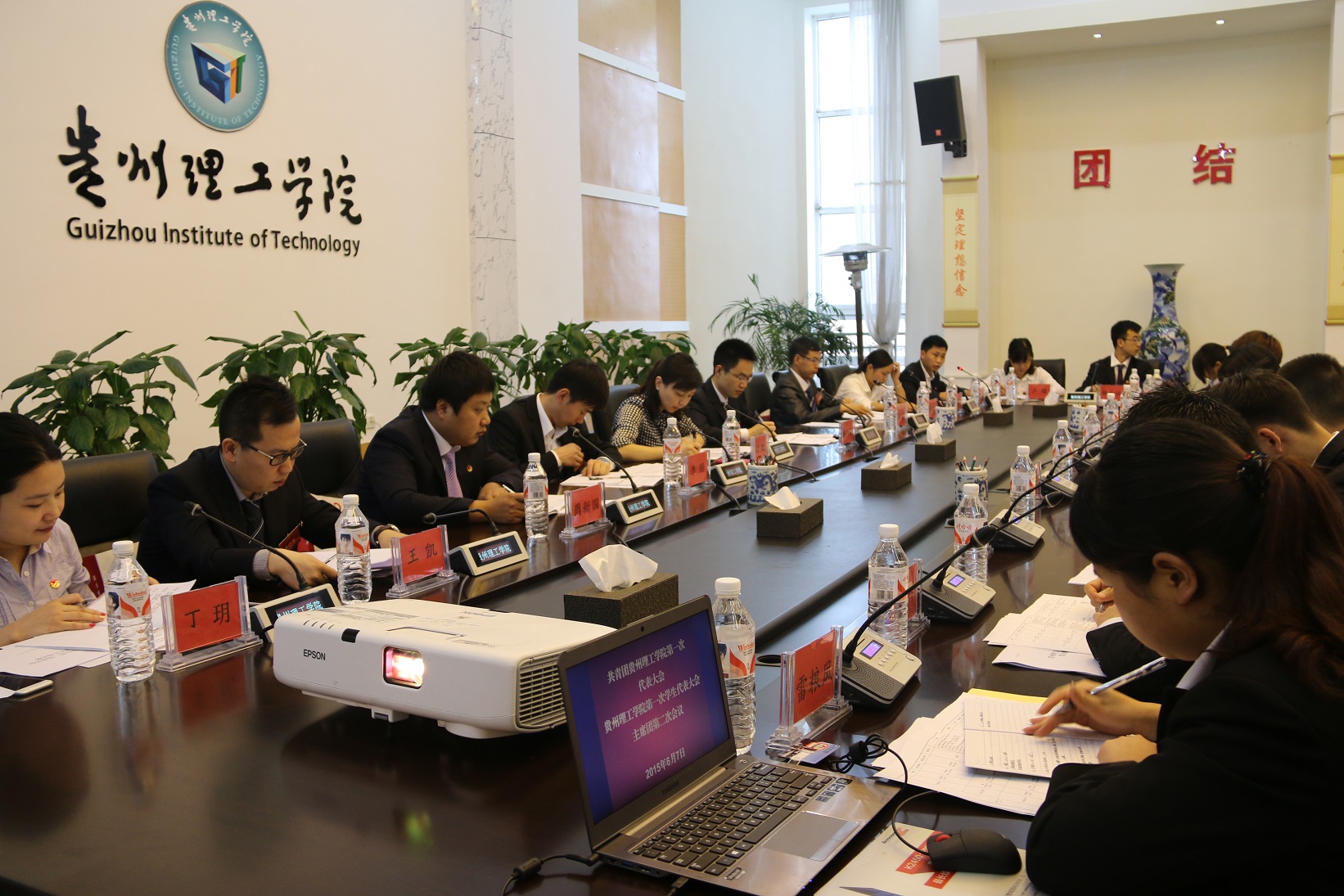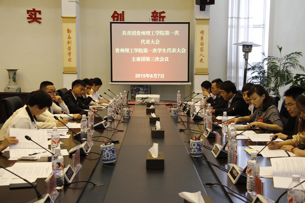 (本网讯 杨荣峰 王靖)6月7日早上9:00,共青团理工学院第一次代表大会、贵州理工学院第一次学生代表大会主席团第三次会议在喀斯特报告厅召开,主席团全体成员参加会议。金敏同志主持会议。