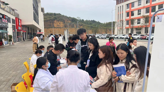 活动当天,三期食堂门口的乙肝免费检测备受同学们关注,众多同学积极参与。现场医护人员认真为同学们进行检测,并耐心解答疑问。与此同时,志愿者们积极发放禁毒防艾宣传资料,趣味小游戏更是将活动气氛推向高潮,同学们在游戏中加深了对禁毒防艾知识的理解。