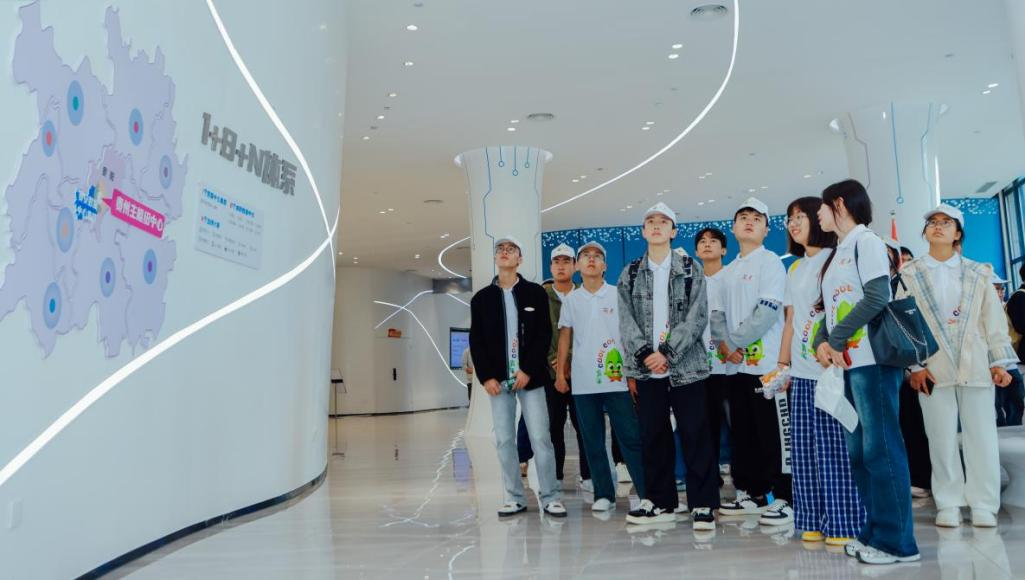 接下来,同学们前往大数据科创城参观学习。通过观看展示墙、视频介绍以及讲解员的讲解下,可以知道当前大科城正以数字经济为主导,紧扣“数字产业和人才集聚区、数字场景应用示范区、生态文明展示区”的三大定位,以科技创新为支撑,以人才集聚为重点,按照“一心两园三谷”,围绕打造其产业布局,聚焦打造数字经济产业集群、先进装备制造产业集群、新能源新材料产业集群“三大产业集群”,使同学们感受到了数字科技的强大魅力。