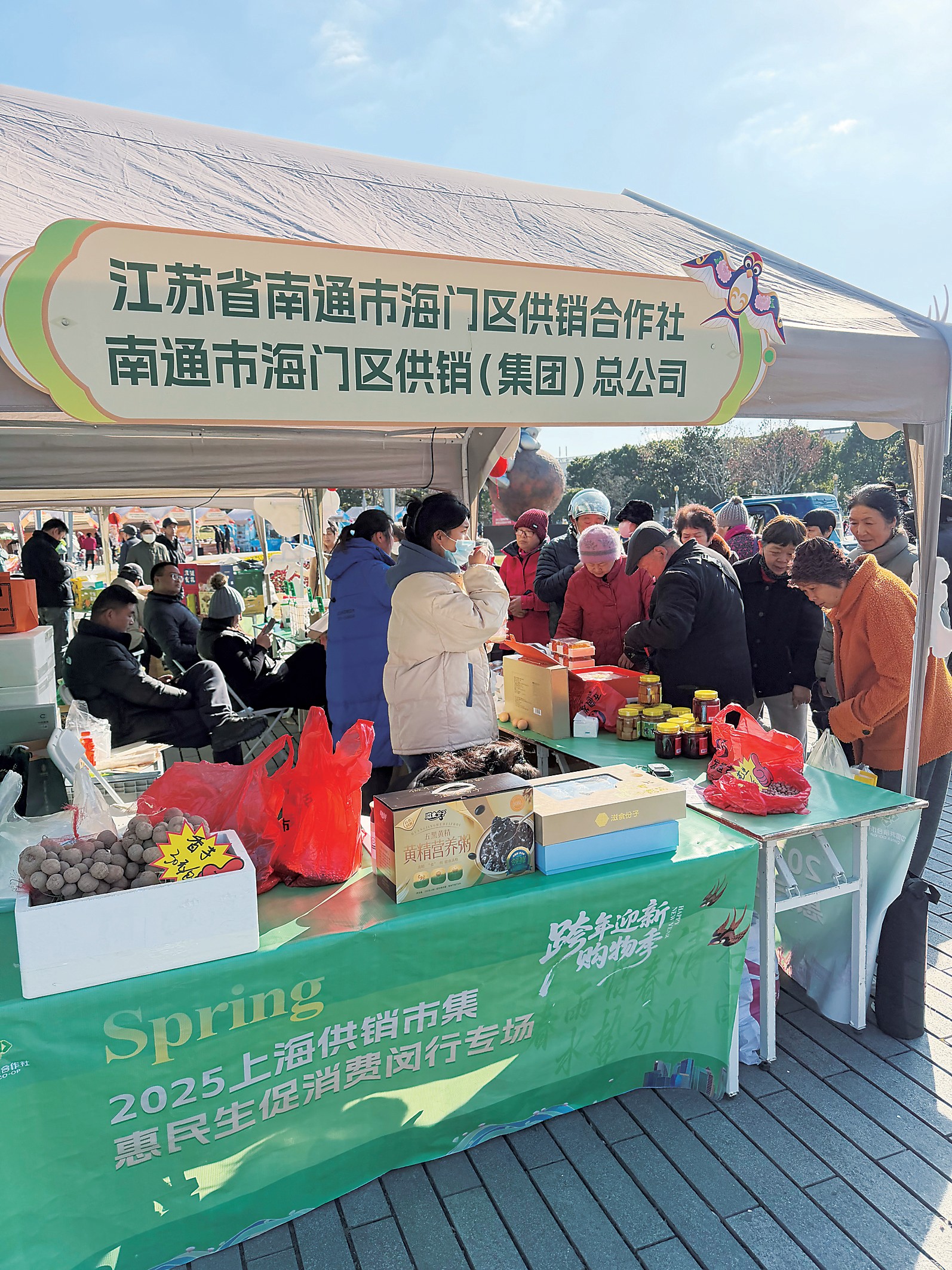 “供销+”激发农产品消费活力。通过“品牌引领、节会驱动、场景融合”组合策略,持续提升海门农产品在长三角区域的市场竞争力和品牌美誉度。深度参与上海二十四节气市集专场、省市专题市集等展会40余场次,推介海门特色农产品50多个品类,累计达成合作意向30余项。2024年10月首次主办“鲜活海门供销优选”上海嘉定永盛里市集推介活动,各大媒体浏览量超两万,得到南通市副市长刘洪批示肯定。主动开展供销市集进社区、进高校活动,通过新春供销大集、啤酒嘉年华等主题活动,遵循“加法”逻辑,激发了“供销+”非遗、文旅、赛事、艺术节等场景红利,成为培育农产品消费增长的新引擎。