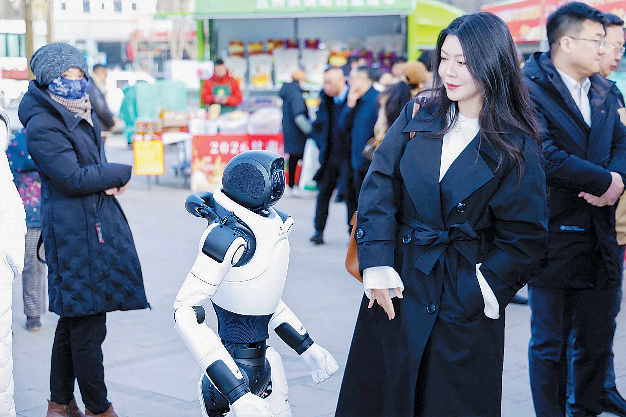 年货节现场,智能机器人穿梭自如,不仅承担迎宾导览、咨询答疑等服务,更化身“讲解员”,生动讲述供销合作社的发展历程。在互动环节,机器人还表演了一段柔中带刚的太极舞蹈,科技与文化的巧妙结合,使其成为活动中引人注目的亮点。
