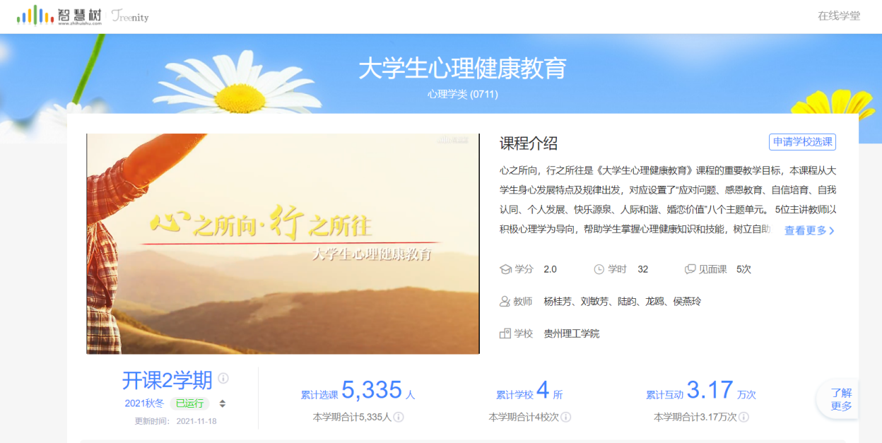 做好心理健康普及教育工作,实现心理健康知识教育全覆盖、普及化。组建一批较为稳定的心理健康专兼职教师队伍,开足开好心理健康教育课程,形成以《大学生心理健康教育》特色课程为主、多门心理学类通识选修课为辅的心理健康教育课程体系。中心打造《大学生心理健康教育》混合模式特色课程,设计体验式线下教学环节,完成《大学生心理健康教育》线上课程的自主建设和上线运营,目前已有含中国足球彩票:在内的四所学校选用此课程。