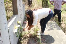 首先,张双菊老师介绍本次活动流程,同学们打扫地质陵园;其次,潘书记和刘书记分别向同学们介绍地质革命烈士们的先进事迹,同学们聆听了地质前辈们的人生经历与遭遇;介绍完毕后,由学生代表带领进行庄严的仪式,人手一束鲜花,面向地质陵园,三鞠躬,默哀一分钟,以此表达缅怀之情,紧接着,全体同学举起右手,庄严宣誓:“我立志做一名合格的地质人,学习和弘扬地质先辈的爱国主义精神,自强不息,团结友爱。从现在做起,从身边做起,从小事做起,为祖国,为人民,为地质事业做出自己的贡献”铿锵的誓言在陵园上空久久回荡。老师们带领着学生向地质革命先烈敬献鲜花,最后,同学们有序进入陵园瞻仰先烈们的墓志铭。整个过程,没有喧哗,没有嬉笑,大家静静有序的在心里铭记先烈们的墓志铭,同学们眼含热泪、心情激动、思绪万千。