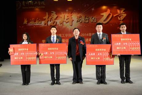 (龙奋杰校长为获得国家励志奖学金同学颁发证书和奖金)