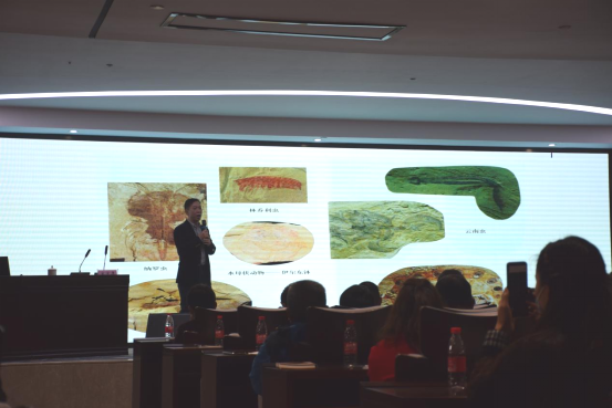 随后,贵州大学副教授、硕士生导师喻美艺教授做了题为《贵州主要古生物化石群的特征及科学价值》的专题讲座,喻教授介绍了贵州瓮 安生物群、凯里生物群、关岭动物群等世界著名的古生物化石群的特征、意义;古生物群生活的环境和时代;古生物的演化历程,它们的科学价值与国际地位及贵州在地史时期的演变历史。
