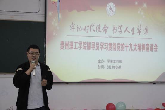 为做好毕业学生思想政治教育工作,落实学校文明离校有关文件精神,营造良好毕业生离校爱校氛围,2019年6月14日,由学生工作部主办、资源与环境工程学院承办的“牢记时代使命·书写人生华章”辅导员校园宣讲会在三教113举行,此次宣讲会由贵州理工学院2017-2018学年优秀辅导员李永老师主讲,资环学院100多名2019届毕业生同学聆听了宣讲。李永老师以十九大精神为切入点,从做合格毕业生、成幸福社会人角度出发,结合毕业生在毕业季遇到的困惑来展开宣讲。