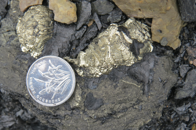 3月20日早晨,实习小组一行七点半吃完早餐,计划前往目的地乌龙寺矿区进行铝土矿矿层追索。8点半左右,我们来到矿区,在矿区剖面进行工作,追索铝土矿含矿层,我们追索了十多分钟。突然,在二叠系“梁山组”炭质页岩里面有了惊人的发现。在这一岩层里面,大家看到了我们从未在现实社会中见到的黄铁矿结核体,有结核状的,直径2~10cm;板状的以及条带状的黄铁矿,大家都激动不已,立即拍照发给指导老师程国繁确认,经过老师多年的野外经验判断分析,这是极为罕见的黄铁矿结晶集合体。由矿区剖面分析,二叠系“梁山组”黄铁矿结核岩层的底板为石炭系九架炉组浅灰白色铝土质泥岩,顶板为是褐色厚层块状砂岩,砂岩层里面也有黄铁矿的发现,多呈现为板状和条带状,但是没有炭质页岩里面的黄铁矿结核体发育。